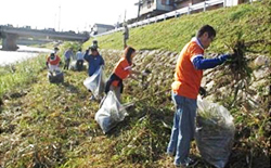 当日は、社員が河川敷で刈り草を袋詰めする作業に汗を流しました。