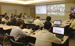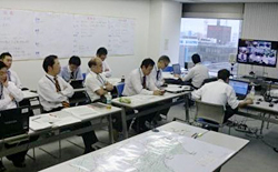 当日は、震災への初動対応による現地対策室の立ち上げ、48時間後までの被災状況や安否確認等の情報収集、TV会議システムやインサマルサットBGANを利用した拠点と災害対策本部間の通信連携等の確認が行われました。