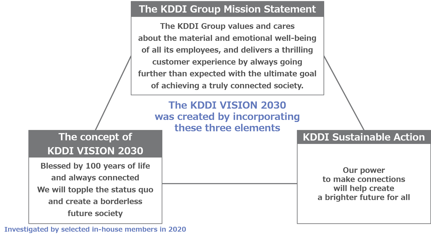 KDDI VISION 2030 is an easy-to-understand message that adds elements of Sustainability Management (The KDDI Group Mission Statement, KDDI Sustainable Action) to the 2030 vision.