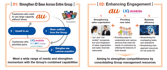 First, [01] we stem outflow from the Group by leveraging the KDDI Group's brands, including MVNO, for customers wanting to move from "au" to a budget smartphone. Then, [02] we maximize Group IDs by more actively making new acquisitions from the highly liquid MVNO market while enhancing the competitiveness of the KDDI Group brands, including MVNO.
