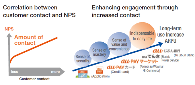 Analyzing the last few years, we see a correlation: the more contact we have with customers, the higher NPS*1 rises. In addition, we discovered that of the numerous life design services we have, "au PAY," which is used daily by customers, had a particularly large effect.