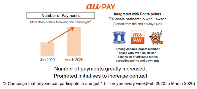 To raise awareness of "au PAY," over a seven-week period from February 2020, we carried out a campaign to award "au WALLET" Points equivalent to a maximum of 20% of settlement amounts. That had a significant effect, greatly helping to enhance the presence of "au PAY," such as by significantly raising awareness and getting many non-"au"customers to sign up.