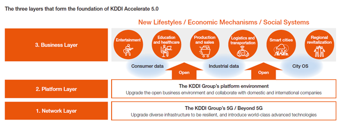 As the effects of the COVID-19 pandemic drag on, the need has grown rapidly for telework, online education, remote healthcare and the like, highlighting the social importance of the ICT infrastructure that maintains economic activity and consumers' peace of mind and safety in Japan. In addition, each industry is expected to create a resilient business model, supporting economic growth in Japan and an even brighter society, bursting with vitality, for the future. Against this social backdrop, we put together KDDI Accelerate 5.0 with the aim of contributing to the era of the new normal by actively working to build networks and platforms and to create business models.