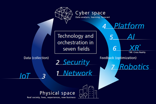 To accelerate Society 5.0, technology evolution is required to further accelerate the integration of physical spaces, where real people and things exist, and cyber spaces, which are the world of computers.