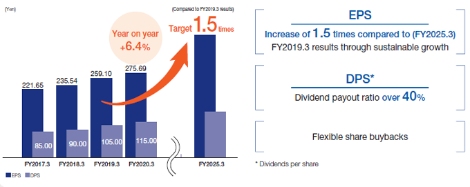 Under the medium-term management plan unveiled in May 2019, KDDI targets growth of 1.5 times in basic earnings per share (EPS) by the fiscal year ending March 31, 2025, compared with the level in the fiscal year ended March 31, 2019, while sustaining growth in profits.