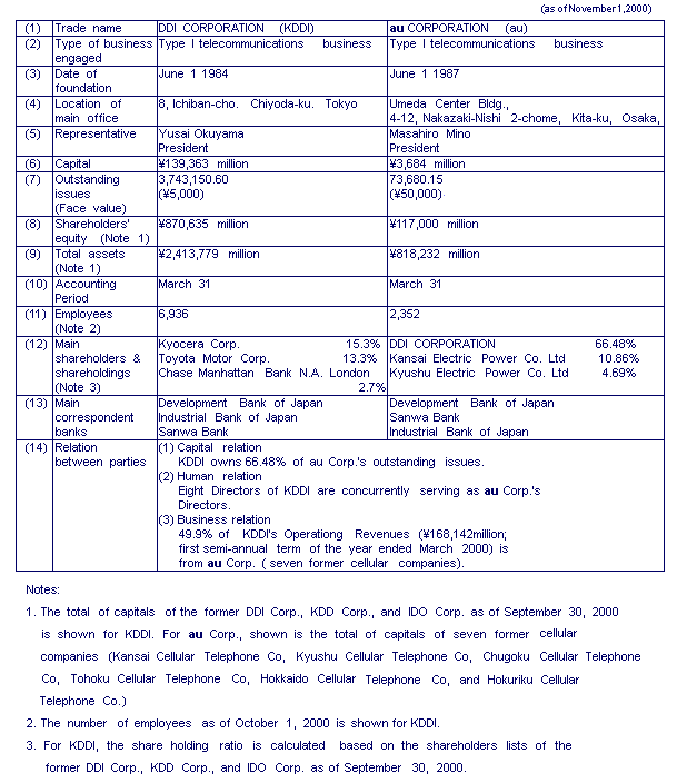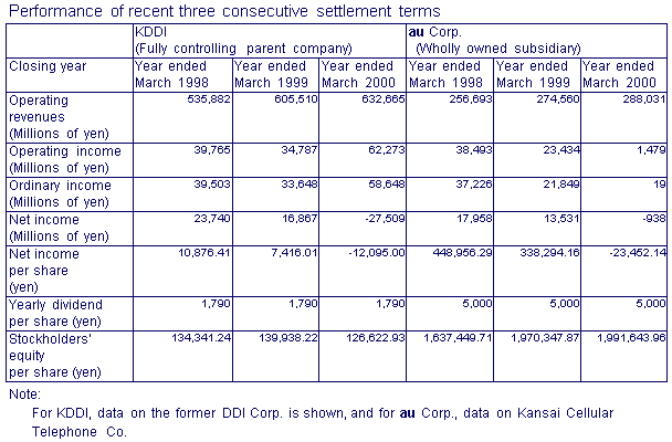In particular, KDDI recognizes that au Corp., born on November 1 this year, is a strategically core business offering high quality nation-wide seamless services under its nationally unified brand,"au" besides the mobile business in Kanto and Tokai Areas provided by KDDI. KDDI places great importance on au Corp. as a business for substantiating its own "Mobile & IP" strategy.