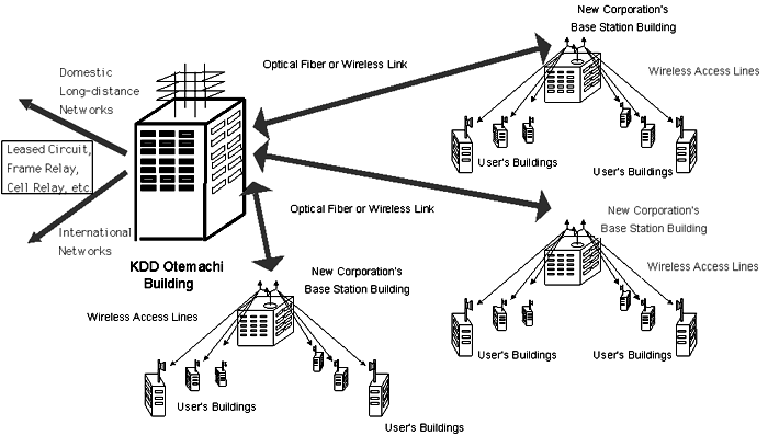 KDD WinStar is capitalized at 1 billion yen as of its service inauguration, invested by KDD with 550 million yen (55%), by WinStar with 350 million yen (35%) through WinStar International, its wholly-owned U.S. subsidiary, and by Sumitomo Corporation with 100 million yen (10%). In September last year, the Ministry of Posts and Telecommunications unveiled its basic concept regarding technical conditions including frequency allocation to the FWA, with a view to facilitate competition in the local telecommunications market and to enable wireless-based broadband information interchange such as multi-media communications and others with great potential demand. Based on this concept, the three companies have been conducting a customer survey for a joint business opportunity and, considering that the FWA would provide faster means for implementing circuits and changing transmission speeds compared with wired access lines while giving more economical service options due to lower costs in establishing links, and that such characteristics have gained eager expectations from the customers, they found enough feasibility to justify the establishment of a new corporation. KDD WinStar, making the best use of the advanced wireless technology provided by KDD and business experience and operational expertise accumulated by WinStar as one of the largest FWA operators in the U.S.A., will furnish economical high-speed wireless access using "Point-to-Point System" or "Point-to-Multipoint System"(Note) mainly for business customers with large-volume data transmission needs including Internet service providers, while accommodating varied customer needs, such as establishing domestic and/or global networks, through integrated offering with KDD's telecommunication services.