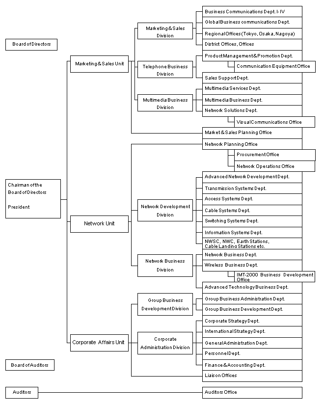 | (1) | Marketing & Sales Unit Existing Marketing & Sales Headquarters will be reorganized into "Telephone Business Division" consisting of planning and marketing support functions for telephone services which are major sources of revenue for the time being, "Multimedia Business Division" consisting of planning and marketing support functions for multimedia services and other related businesses which are to be major sources of revenue in the future, and renewed "Marketing & Sales Division" responsible for marketing and sales of the above services, resulting in the formation of a sales structure with greater mobility. The Telephone Business Division includes newly formed "Communication Equipment Office" to further activities in development and marketing of telecommunications terminal equipment. | |