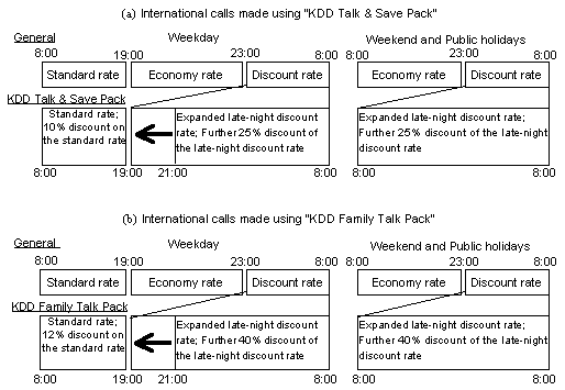With this extension in the discount hours, customers using "KDD Talk & Save Pack" or "KDD Family Talk Pack" for international calls will be able to enjoy the rates for discount hours for all calls except those during the standard hours. In addition, customers are also able to enjoy a further discount for both time periods.