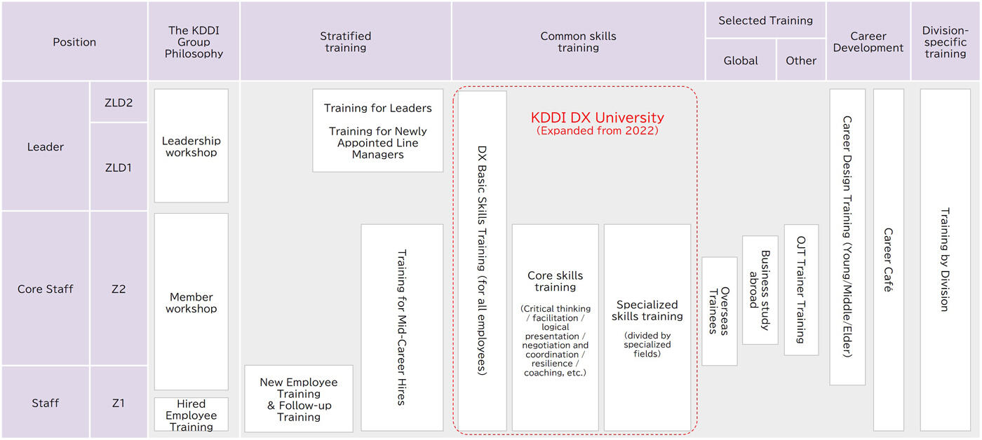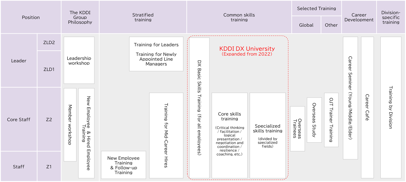 | KDDI DX University (KDU) | A training program system that facilitates the development and expansion of professional human resources in KDDI's core business, including the DX business and various other specialized fields. |