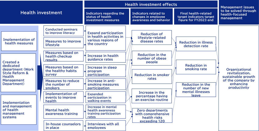 - Work closely with the KDDI Health Insurance Union and the KDDI Workers Union to improve the physical and mental health of our employees and their families.