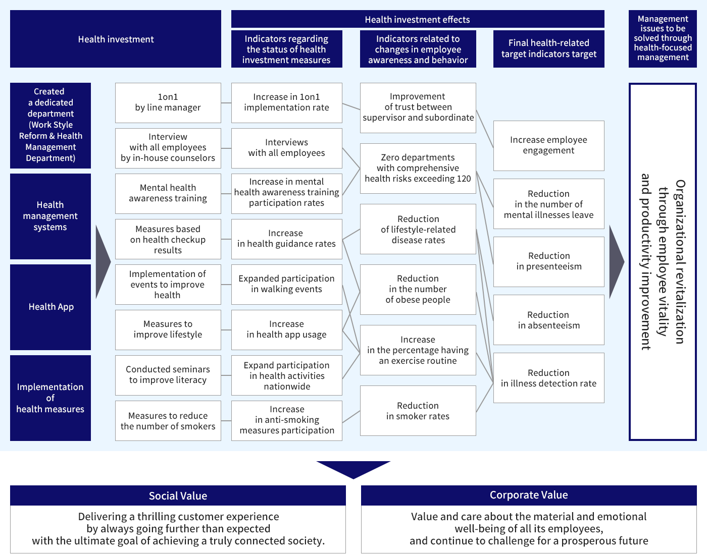 KDDI aims to foster an environment and culture where employees can work healthfully and earnestly to maximize individual and organizational performance.
