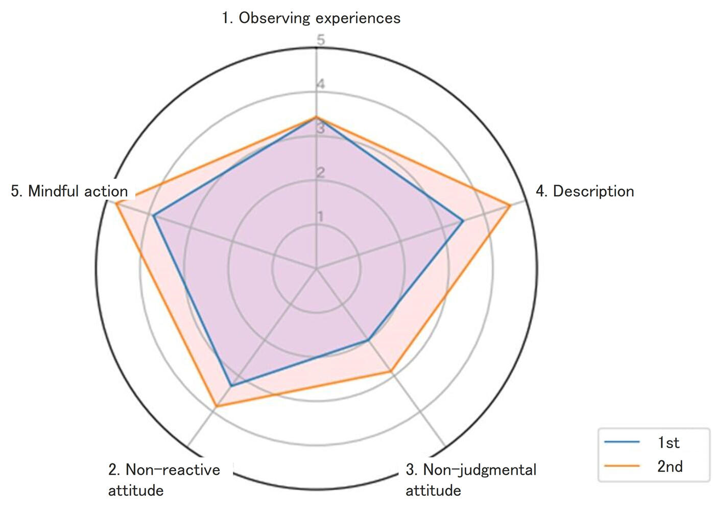 | Measuring changes in the five factors that assess the level of mindfulness before and after the training. |