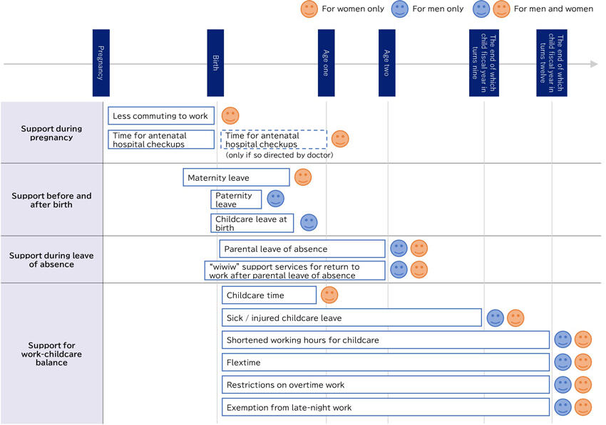 | Shorter working hours system for parents | Introduced to support a good work and childcare balance. Employees can decide their working hours per day between 5 to 7 hours according to their family care responsibilities. Working hours can be changed flexibly each month according to the child's growth, summer vacation, etc., and can also be used in combination with a variable working hours system and a flexible working hours system for parents. |