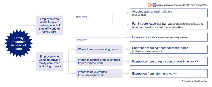 | Shorter working hours system for caregivers | Introduced to support a good work and family care balance. Employees can decide their working hours per day between 5 to 7 hours according to their family care responsibilities. Working hours can be flexibly adjusted every month to accommodate caregiving needs, and it is also possible to combine them with a variable working hours system or utilize the caregiving flextime system. They can use this system as long as care is necessary. |