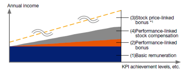 - *2The variable compensation components for the President, Representative Director, Performance-linked stock compensation ratio is approximately 30% and the cash compensation ratio is approximately 70%.