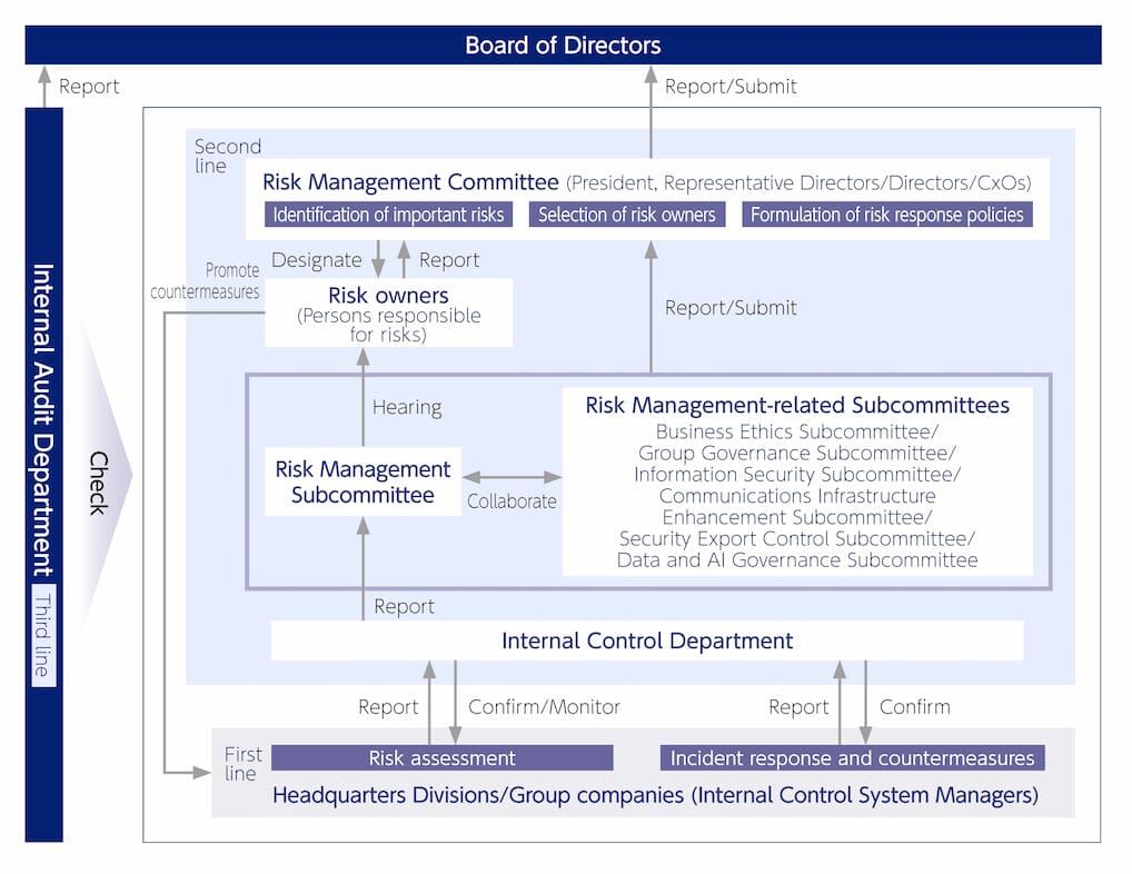 Furthermore, we have established a risk governance framework based on the "Three Lines Model." The first line (business units) promptly controls risks associated with their operations and reports or consults with the second line as appropriate. The second line, led by the Executive Director, Corporate Sector―who is responsible for risk management―oversees risk management across the KDDI Group and reports on its development and operation to the President, Directors, and Audit & Supervisory Board Members. The third line, the Internal Audit Division, conducts audits independently of the first and second lines, identifies issues at Group companies, provides appropriate support, and enhances the effectiveness of risk management.