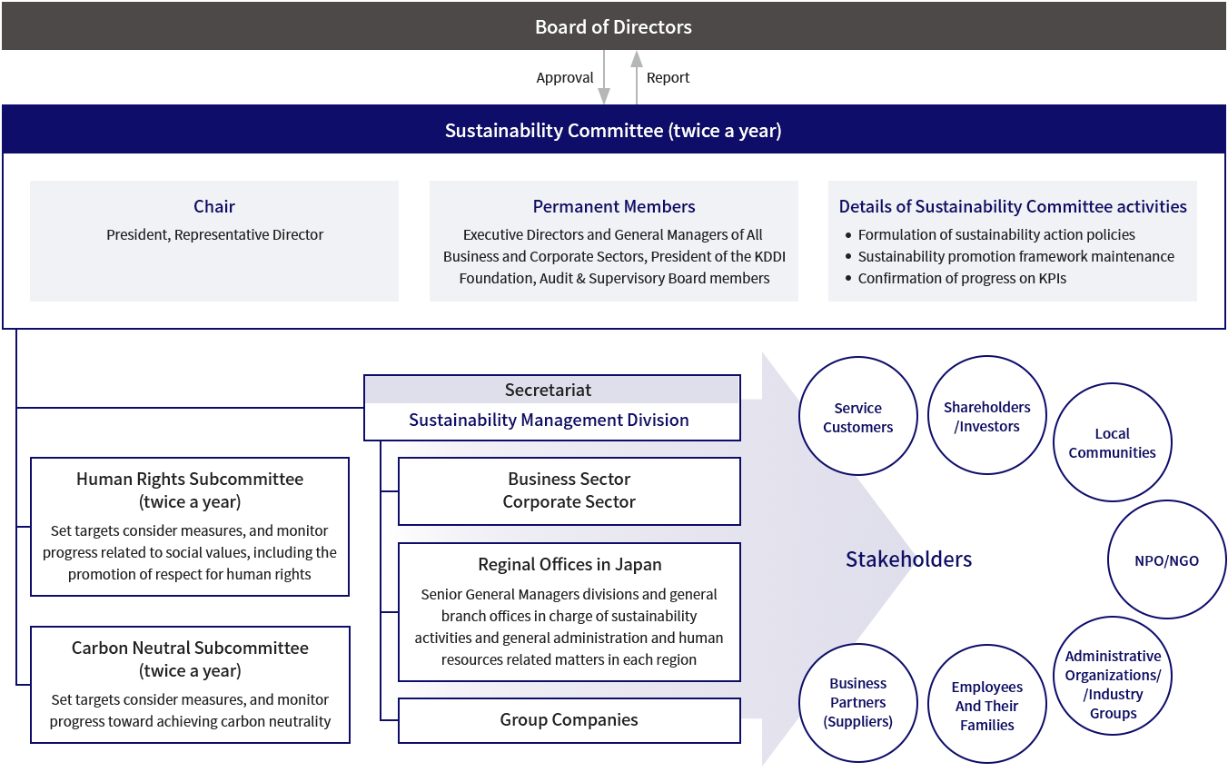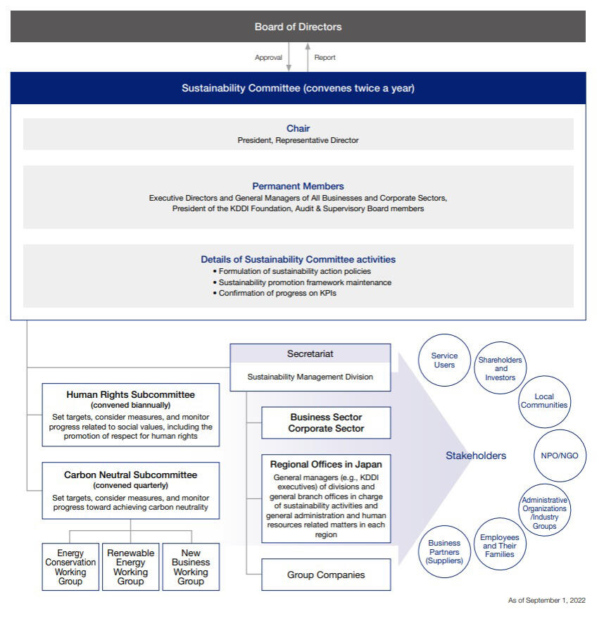 The President of the KDDI serves as the chair with the remaining committee members made up of the executive directors and general KDDI's Approach and Guidelines on Corporate Governance managers of all the businesses and corporate sectors, the Audit & Supervisory Board members of KDDI, and the President of the KDDI Foundation. The committee considers sustainability to be a pillar of company-wide business strategies.