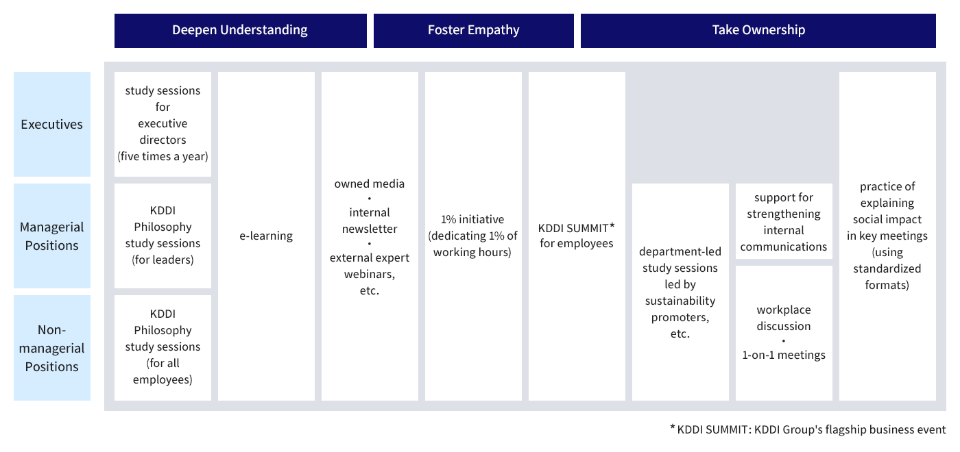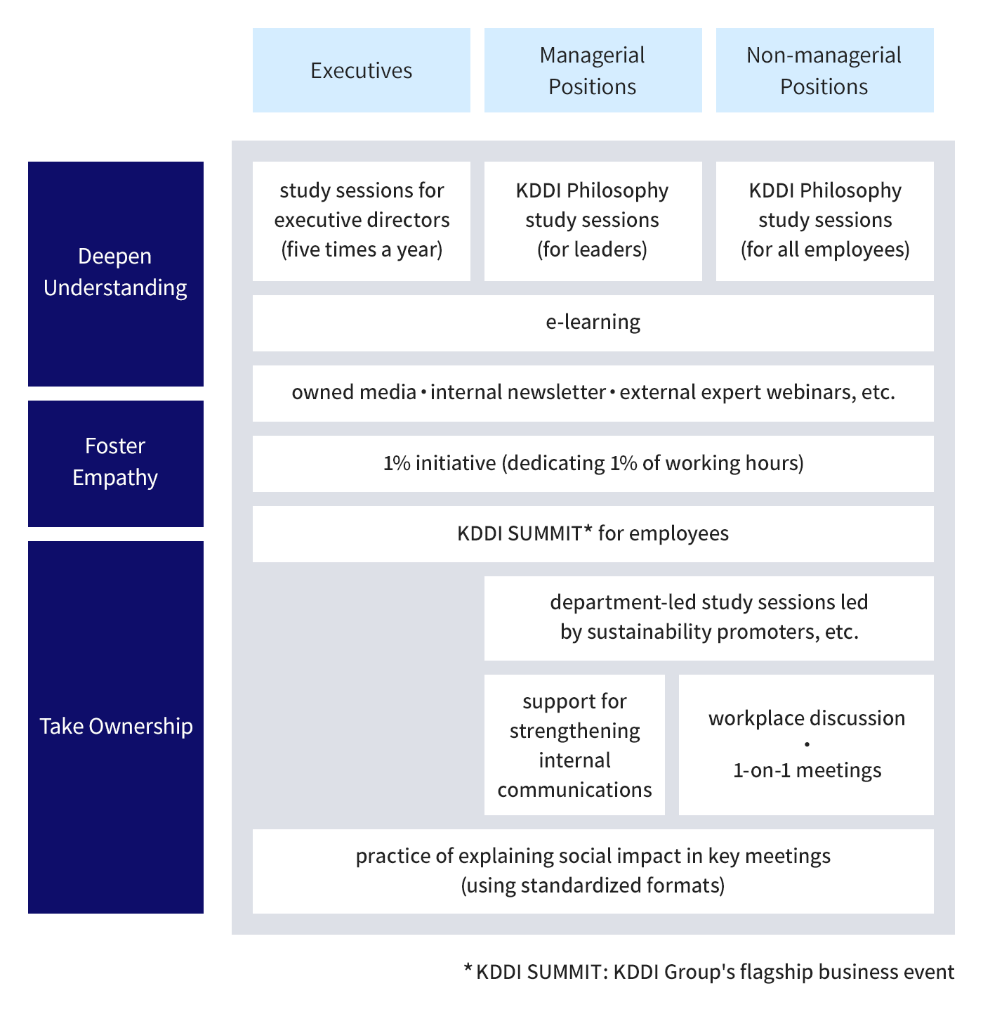 To ensure broad and continuous understanding of sustainability management across all levels―from senior executives to every employee―we have designed a step-by-step approach as shown in the diagram below. Through repeated initiatives, we continuously promote deeper understanding, aiming to foster new learning and awareness.