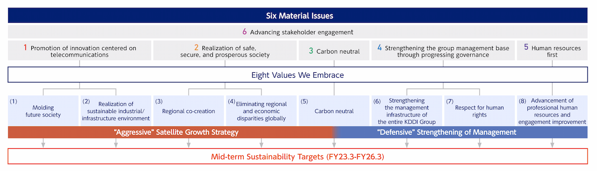 - 6Create social and environmental value by establishing a strong management infrastructure through the strengthening of governance in the entire KDDI Group.