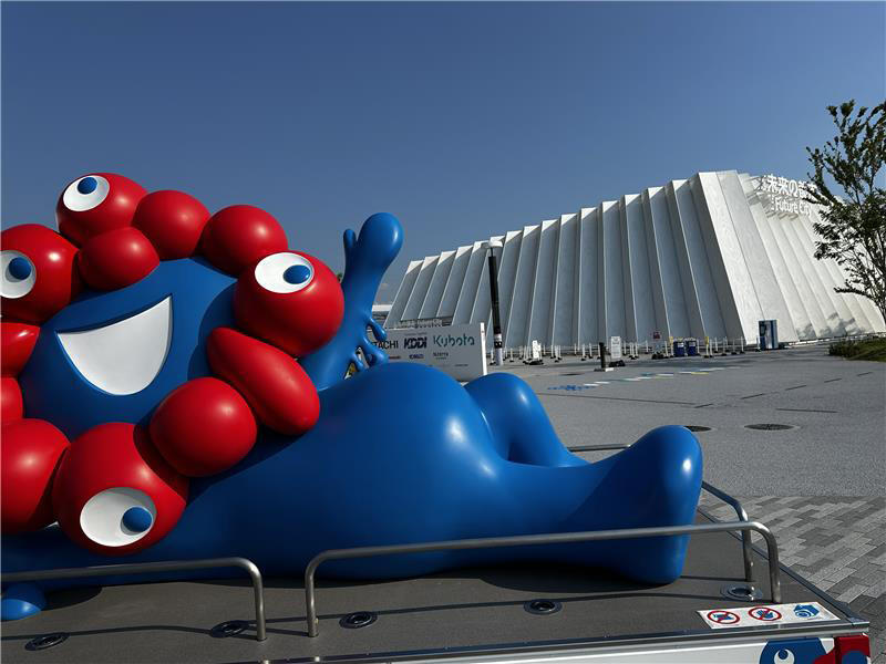寝そべりミャクミャクが未来の都市のすぐ近くに!