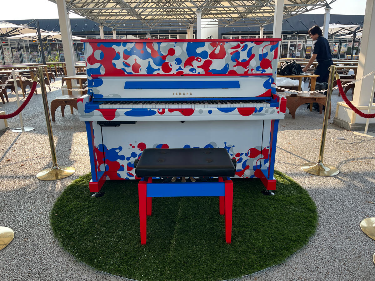 風の広場マーケットプレイス(西エリア)前に、ミャクミャク柄のかわいいストリートピアノがあります。