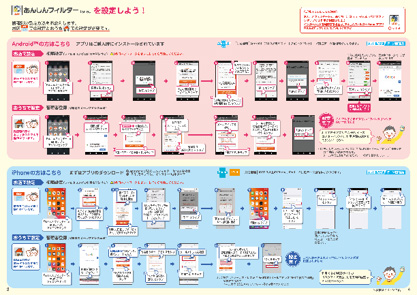 また、新たにフィルタリングサービス冊子「お子さまが安心してスマホを使えるように。」を制作し、フィルタリングサービスの必要性とともに、フィルタリングサービスの機能、お子さまの年齢やお使いの端末によるフィルタリングのレベルや種類、フィルタリングサービスの設定について分かりやすい説明に努めています。
