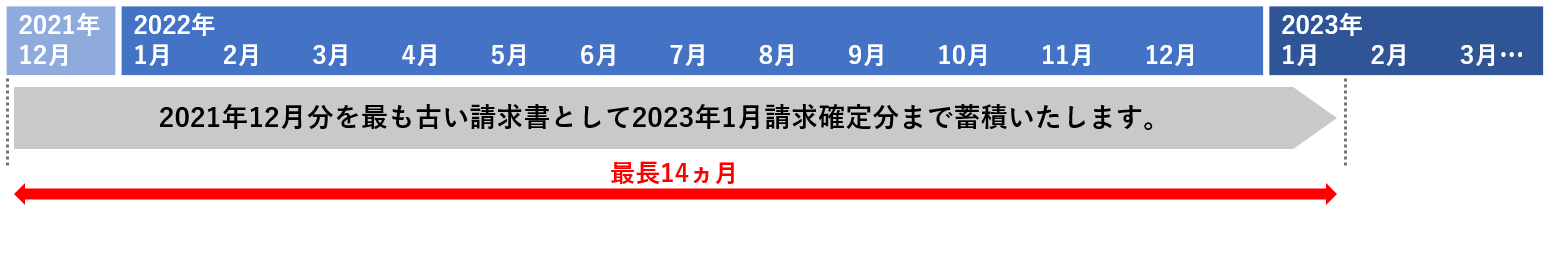 2021年12月分の請求書から毎月1ヵ月ごとに蓄積し、2023年1月には最長期間である14ヵ月分の過去請求書がWEBよりご確認いただけます。