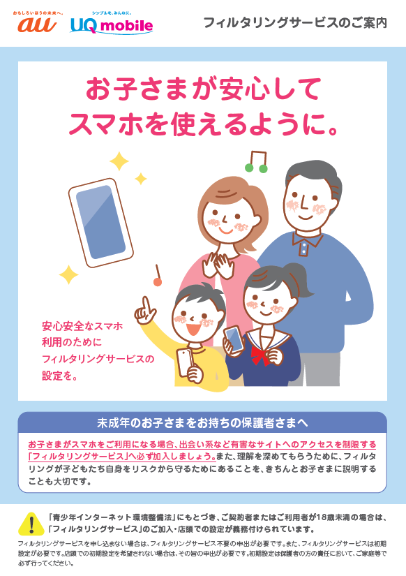 未成年者がスマートフォン・ケータイをご契約・ご利用いただく際、販売店などにおいて、ご利用者が未成年であるか確認をさせていただきます。ご利用者が未成年である場合は、「あんしんフィルター for au」、「未成年WEBフィルター」などのフィルタリングサービスをご案内し、必要に応じて設定のサポートをさせていただきます。