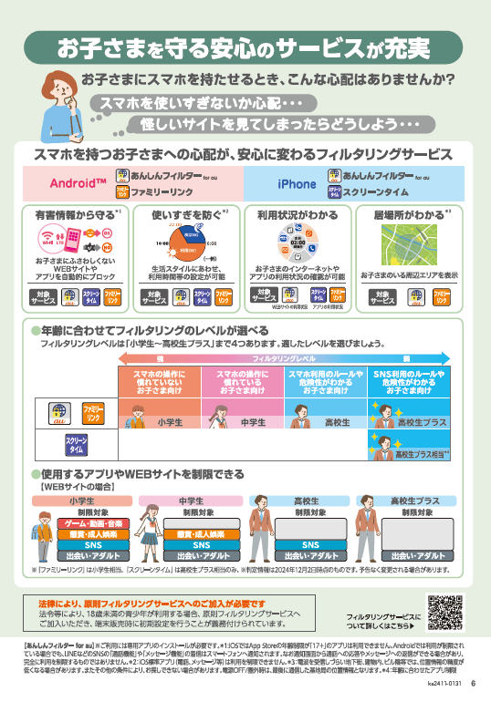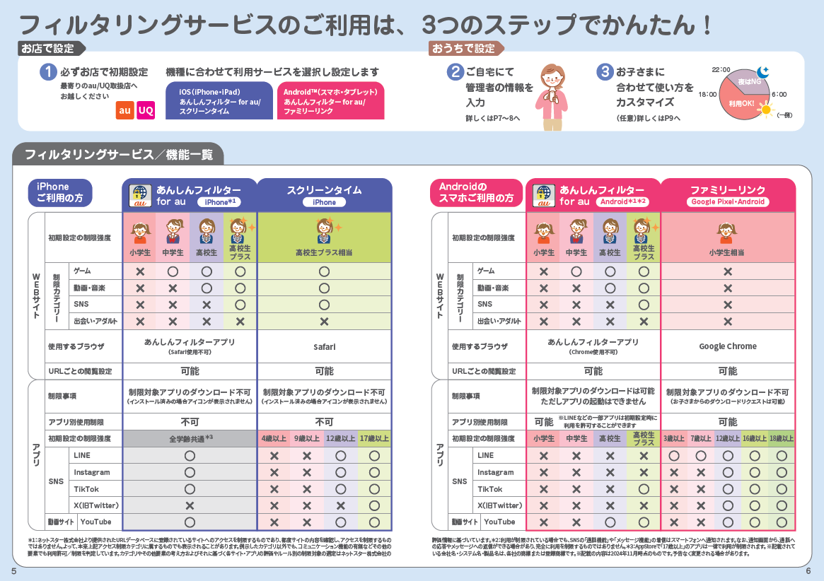 また、1月より、22歳以下のお客さまを対象とした「スマホスタート応援割」の店頭リーフレットにおいても、フィルタリングサービスの必要性とともに、フィルタリングサービスの機能などを分かりやすくご説明・ご紹介しています。