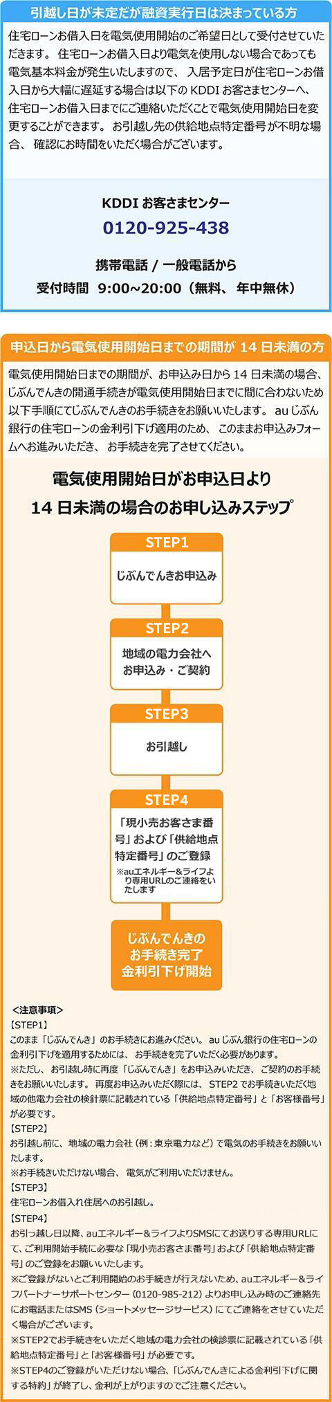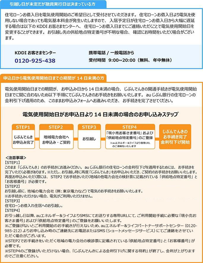 電気使用開始日までの期間が、お申し込み日から14日未満の場合、じぶんでんきの開通手続が電気使用開始日までに間に合わないため以下手順にてじぶんでんきのお手続きをお願いいたします。auじぶん銀行の住宅ローンの金利引下げ適用のため、このままお申し込みフォームへお進みいただき、お手続きを完了させてください。