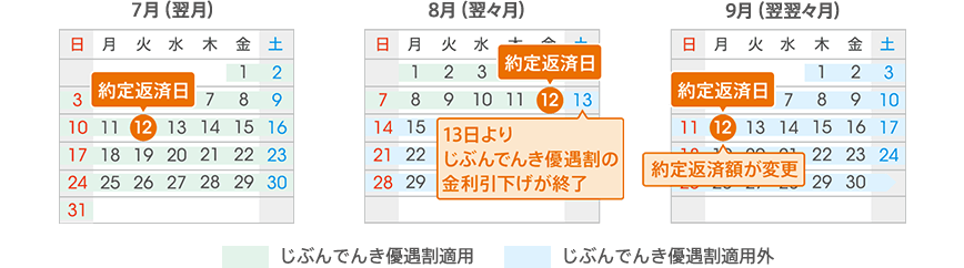 じぶんでんき優遇割が終了となる場合は、判定日の翌翌々月の毎月返済額および半年毎増額(ボーナス)返済額が変更となります。