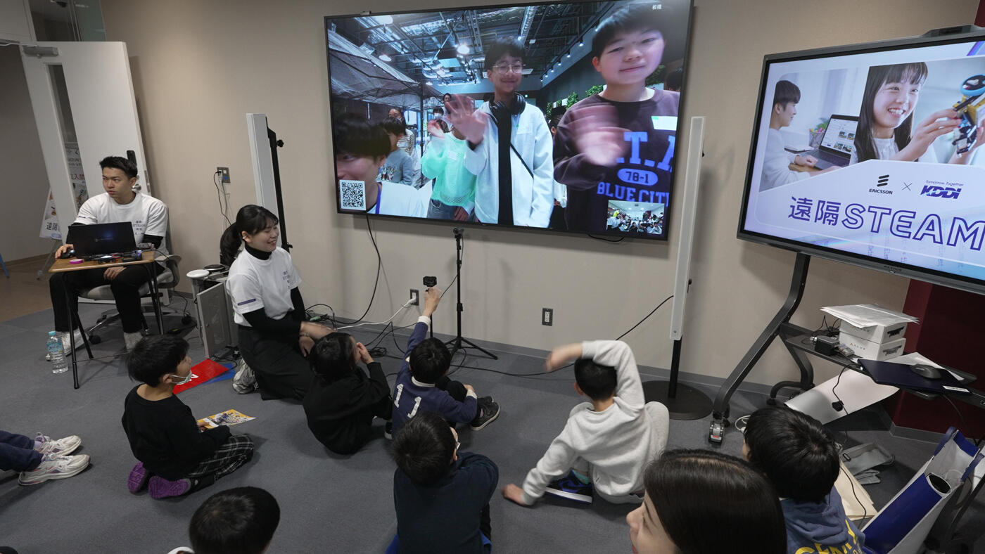 遠く離れた場所の子どもたちと、まるでひとつの空間にいるかのように繋がり、ICTスキルを共に学べる環境を提供する「エリクソン×KDDI 遠隔STEAM教室」。