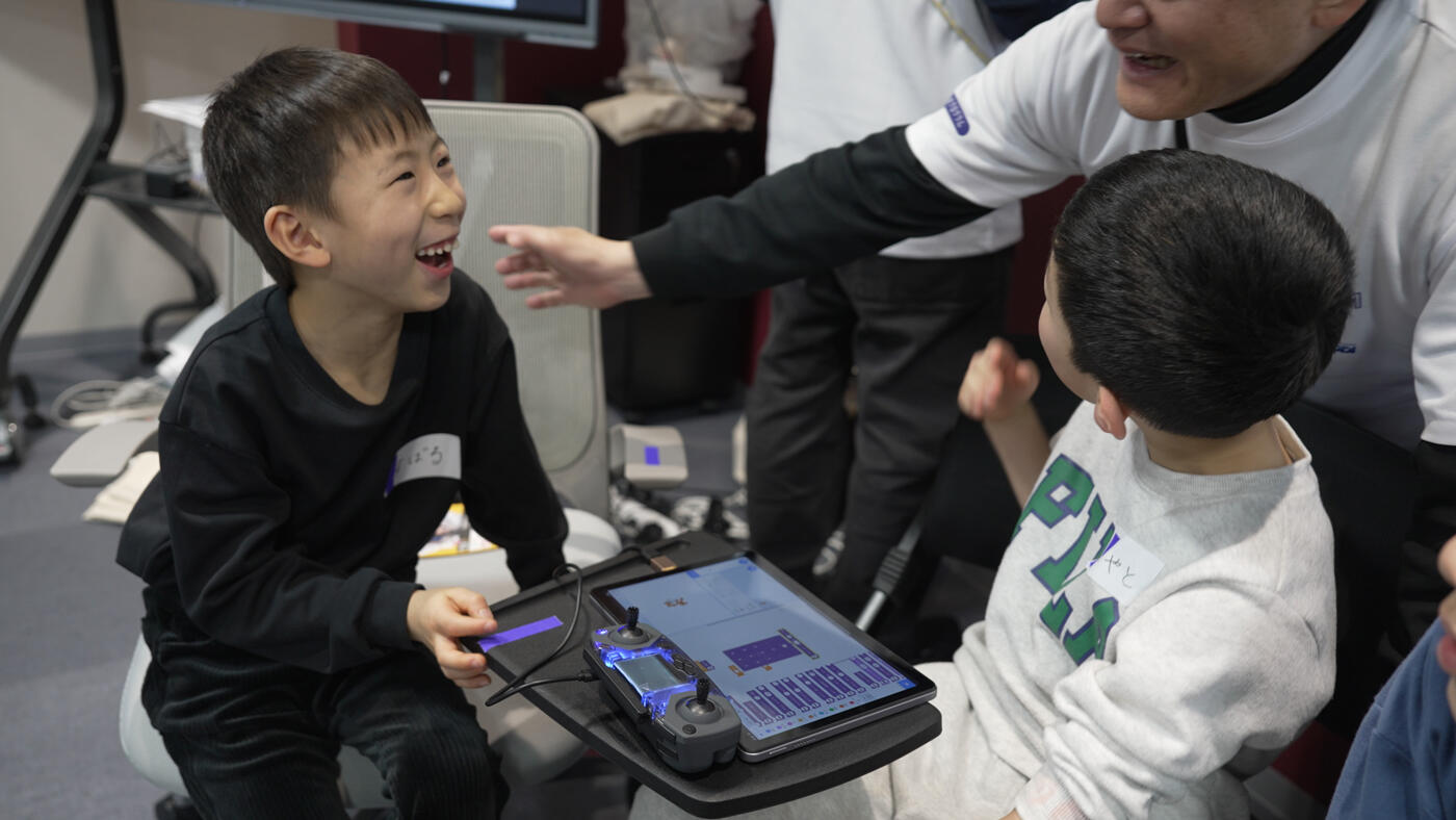 自分で考えてプログラミングしたドローンが音を立てて飛ぶ様子を見た子どもたちは、興奮と驚きの歓声や笑顔でいっぱいです!