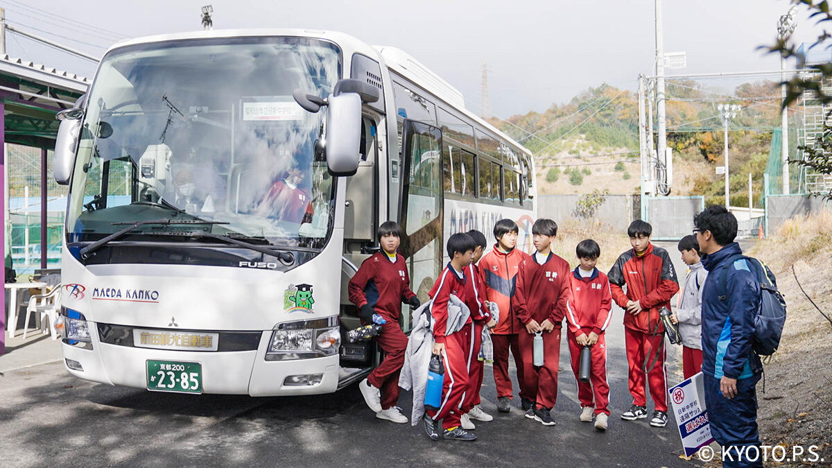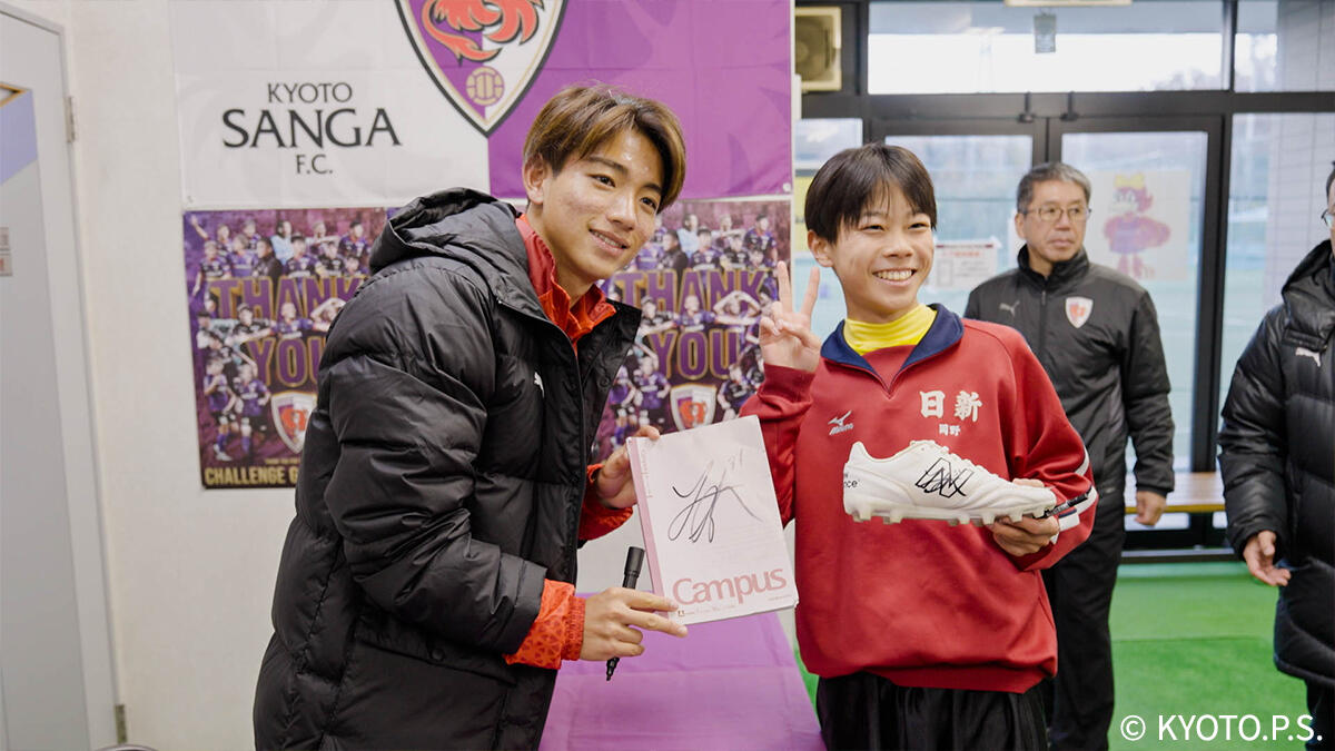サンガタウン城陽に集まった、福知山市立日新中学校27名、山吹サッカークラブ8名は、少し緊張している様子でしたが、平賀選手が現れると子どもたちの目が輝き、「平賀選手だ!」「すごーい!」と次々と歓声が上がるとともに、ワクワクと期待に満ちていました。