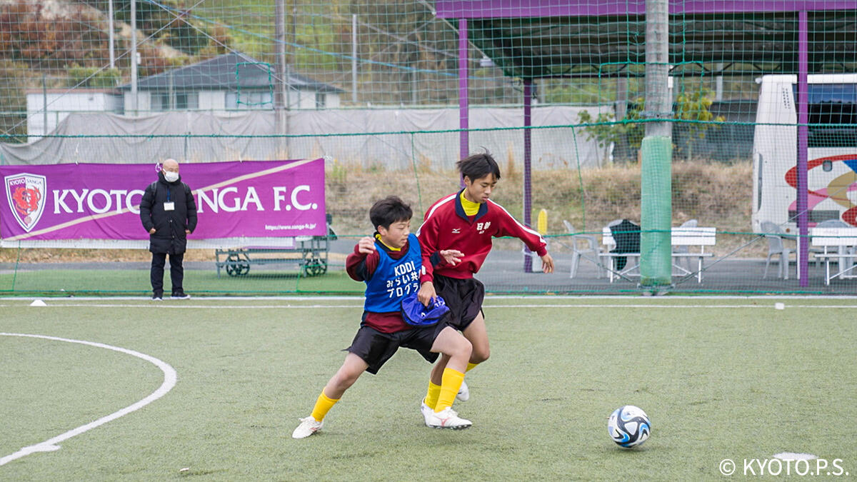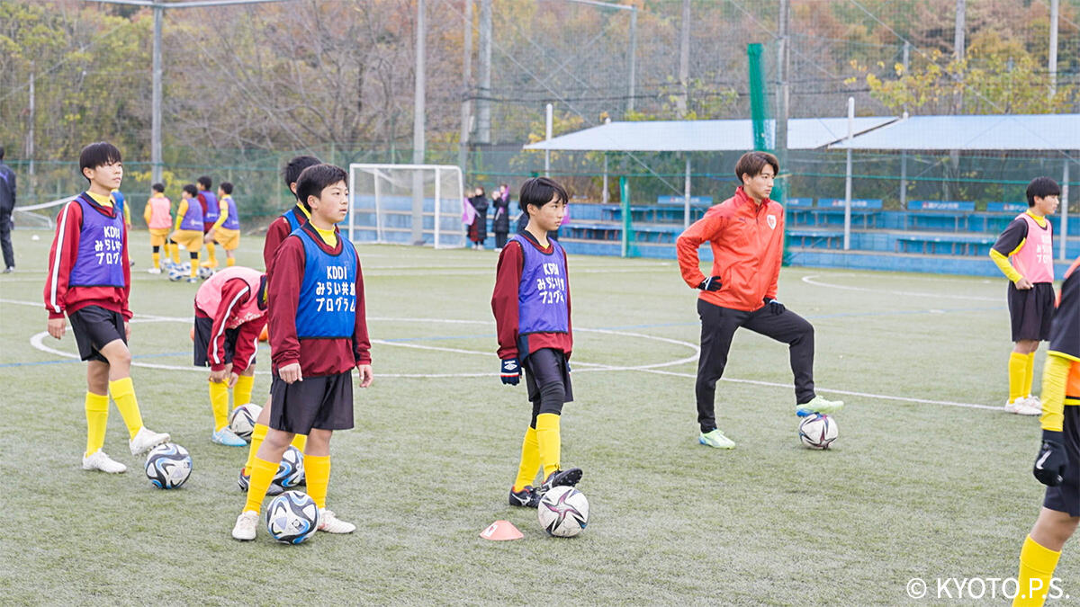 簡単に見えるパス回しでも、「どこにパス出せば、上手く周りを動かせるのか」などを考えながらの練習に苦戦している様子でしたが、平賀選手や京都サンガF.C.のコーチ陣のアドバイスにより、どんどん上達!