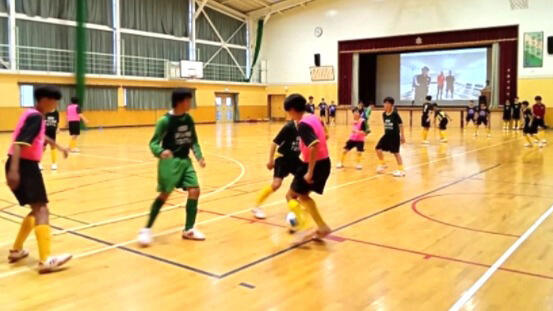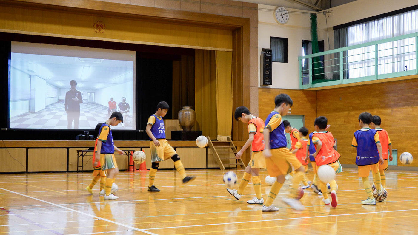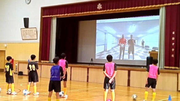 練習はアップから始まり、リフティングや対面パスなどの動きを丁寧に教えてもらうと、子どもたちは熱心に選手やコーチのアドバイスを聞き、積極的に質問するなど、リアルでの練習さながら双方向で自然なやり取りができていました。最後に行ったゲームでは、練習で教えてもらったテクニックを発揮!ゲーム中もスクリーン越しにコーチからのアドバイスが飛び交っていました。