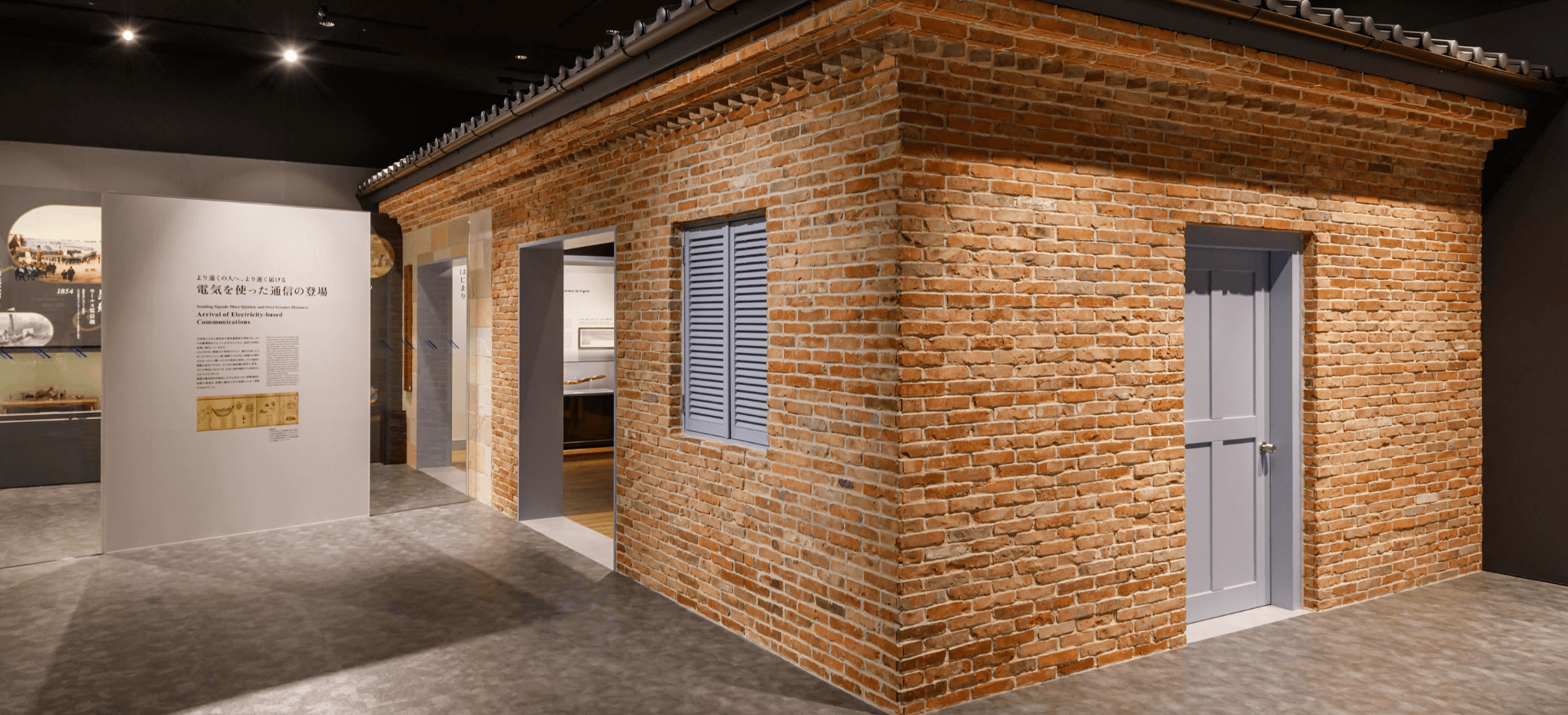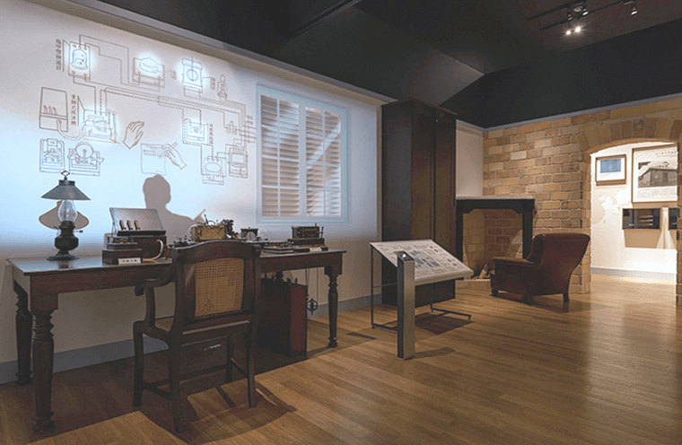 1871(明治4)年、日本は長崎・小ヶ倉に建てられたレンガと石造りの建物に引き込まれた海底電信ケーブルで世界と初めてつながりました。海底線陸揚庫(ケーブルハット)と呼ばれたその建物と中に置かれた予備通信席を復元しています。