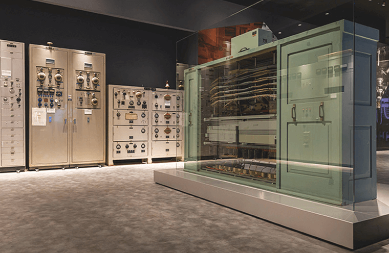 第二次世界大戦後、限りある周波数を効率的に使用し、高い通信品質で日本の国際社会復帰を支えることが、新しく設立された国際電信電話株式会社(KDD)の使命でした。ここに展示されている短波送受信機の一部は、国立科学博物館の重要科学技術史資料に指定されています。