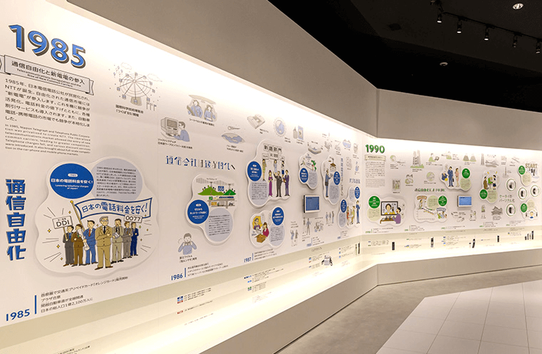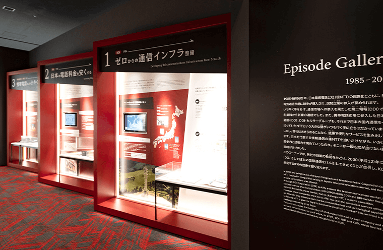 1985(昭和60)年の通信事業への参入から2000(平成12)年までの15年間、KDDIの前身会社のDDIと日本移動通信(IDO)はたくさんの挑戦を繰り返してきました。このコーナーでは、6つのエピソードをピックアップして当時の資料とともに展示しています。