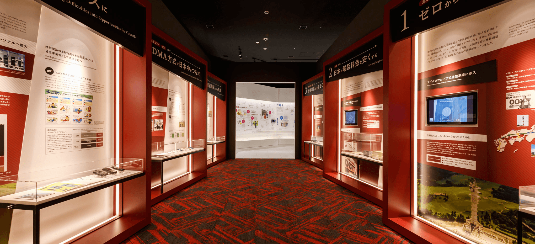 「通信市場参入と挑戦の軌跡」の展示を背に、道なりに1m進むと「KDDIの挑戦」の展示をご覧いただけます。