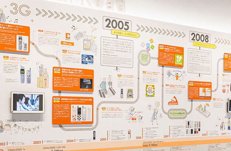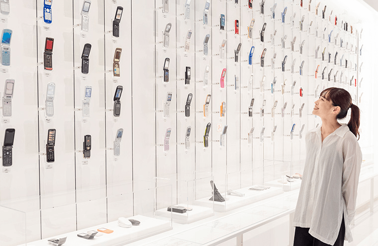 auブランドの携帯電話・スマートフォン約500台とau Design projectの製品およびコンセプトモデルを壁面いっぱいに展示しました。このミュージアムはau Design projectの全ラインアップがご覧いただける唯一の場所になります。担当者が語るau Design projectの誕生秘話も必見です。