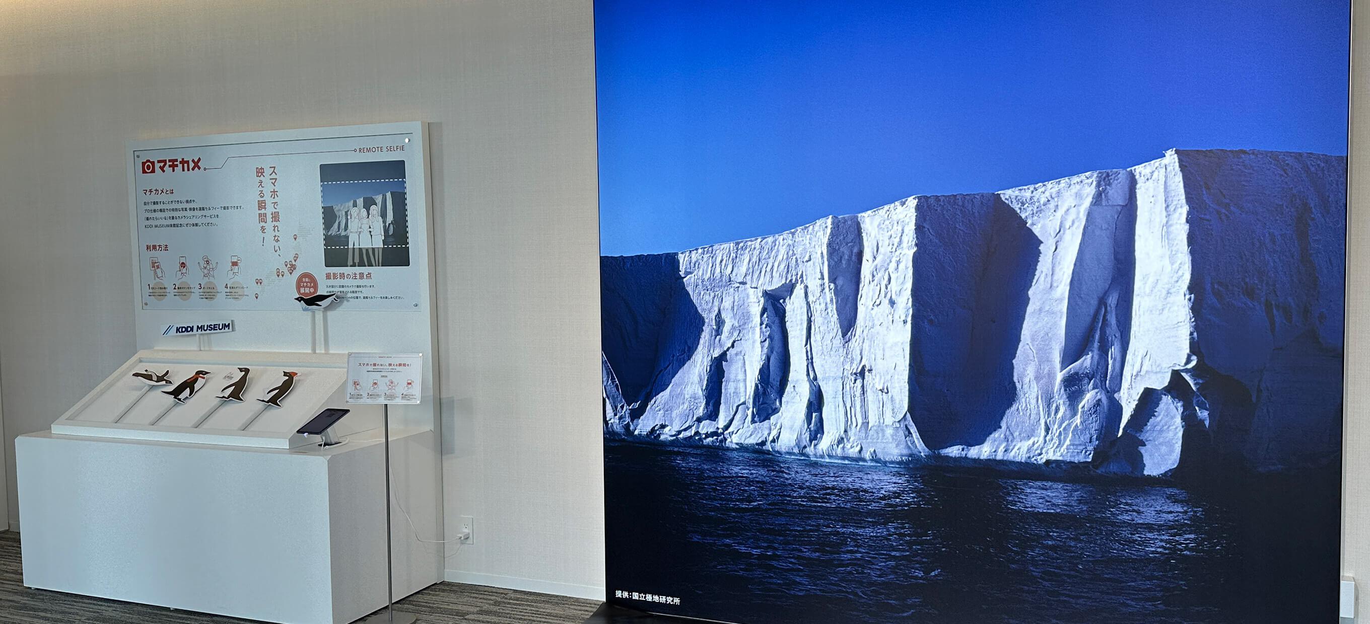 出入り口から会場の外に出て、会場を背にして廊下を10m左に進みます。左側の壁沿いにあるロッカーを通り過ぎると、「Photo Spot -マチカメ-」の展示をご覧いただけます。