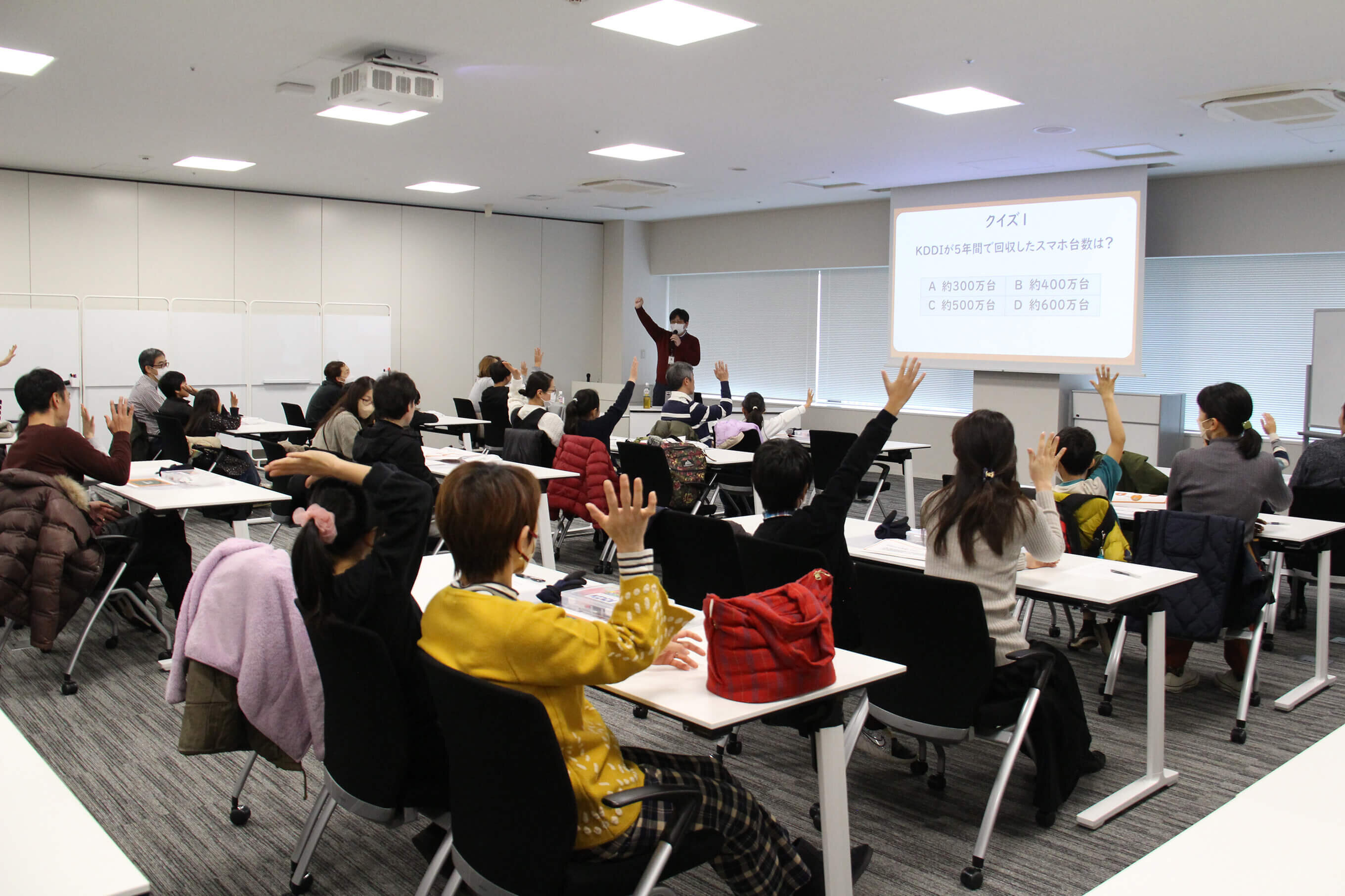 講師からは冒頭、リサイクルの重要性や、KDDIでは使用済みスマートフォンの資源リサイクル率99.8%を実現していることなどの説明があり、参加者はリサイクルに関するクイズも交えながら資源活用について学びました。
