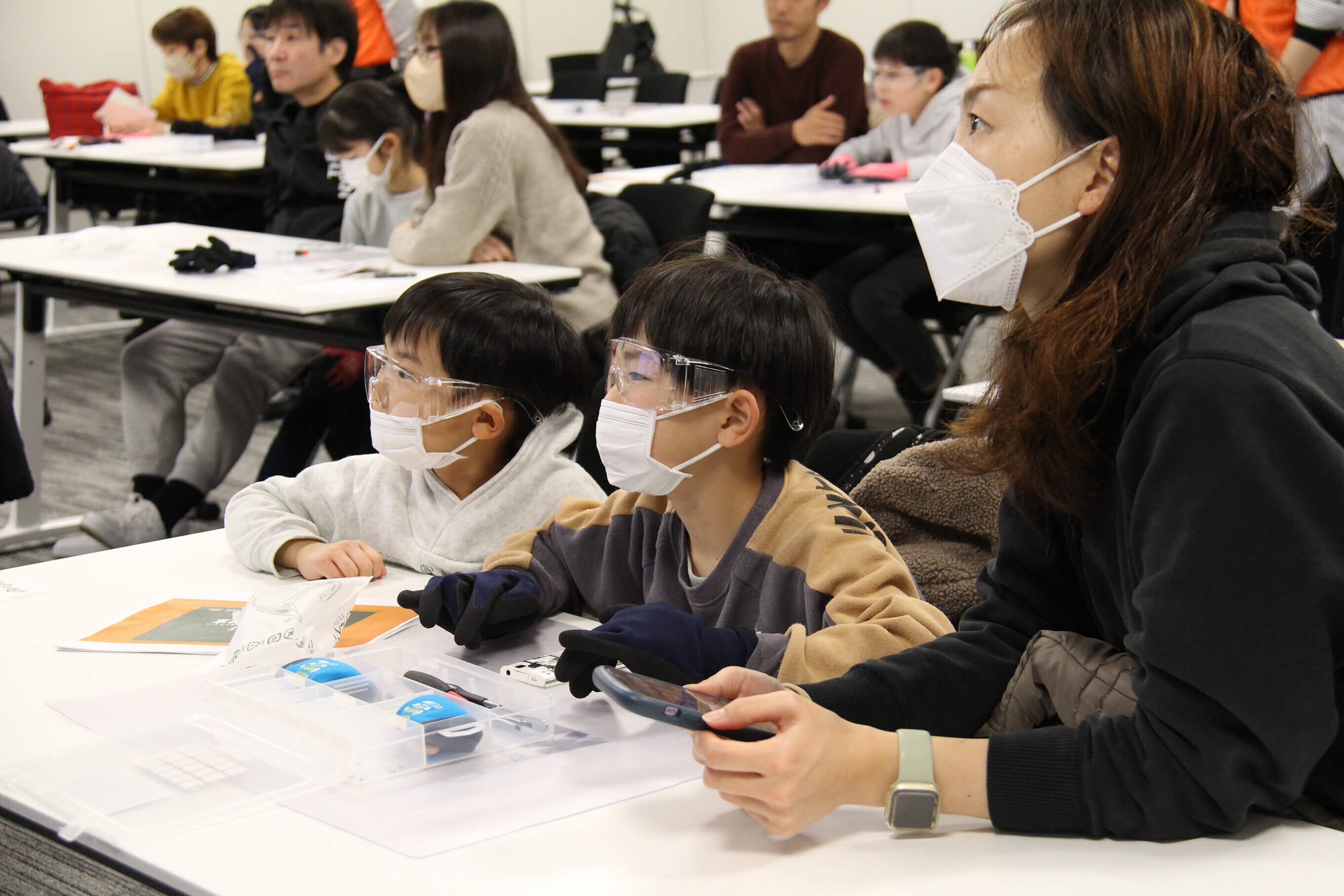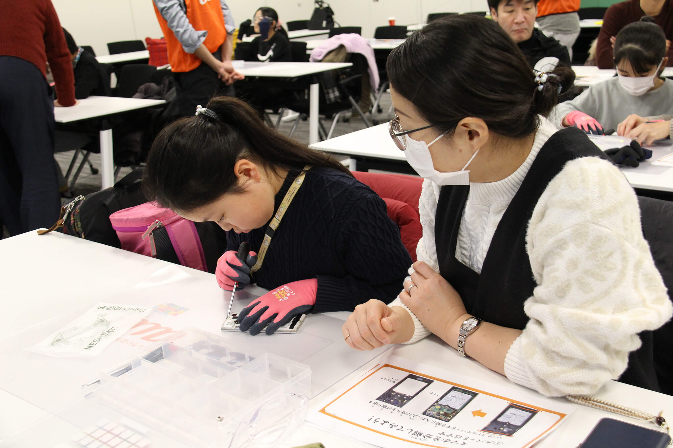 空模様が怪しい寒い日にも関わらず、会場には午前と午後の計2回20組ほどのご家族が集い、講師の説明に従って使用済みスマートフォンの手分解に挑戦しました。