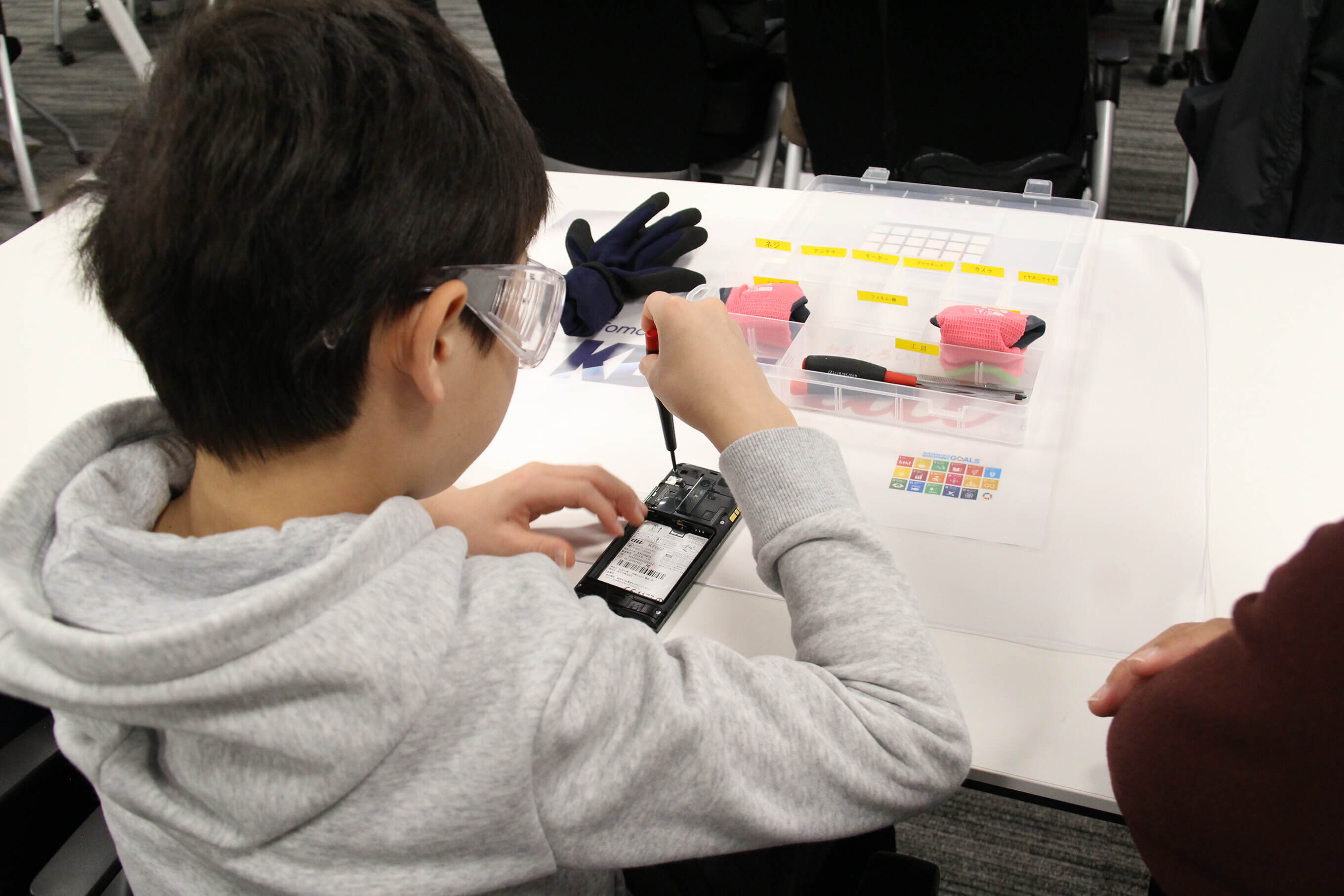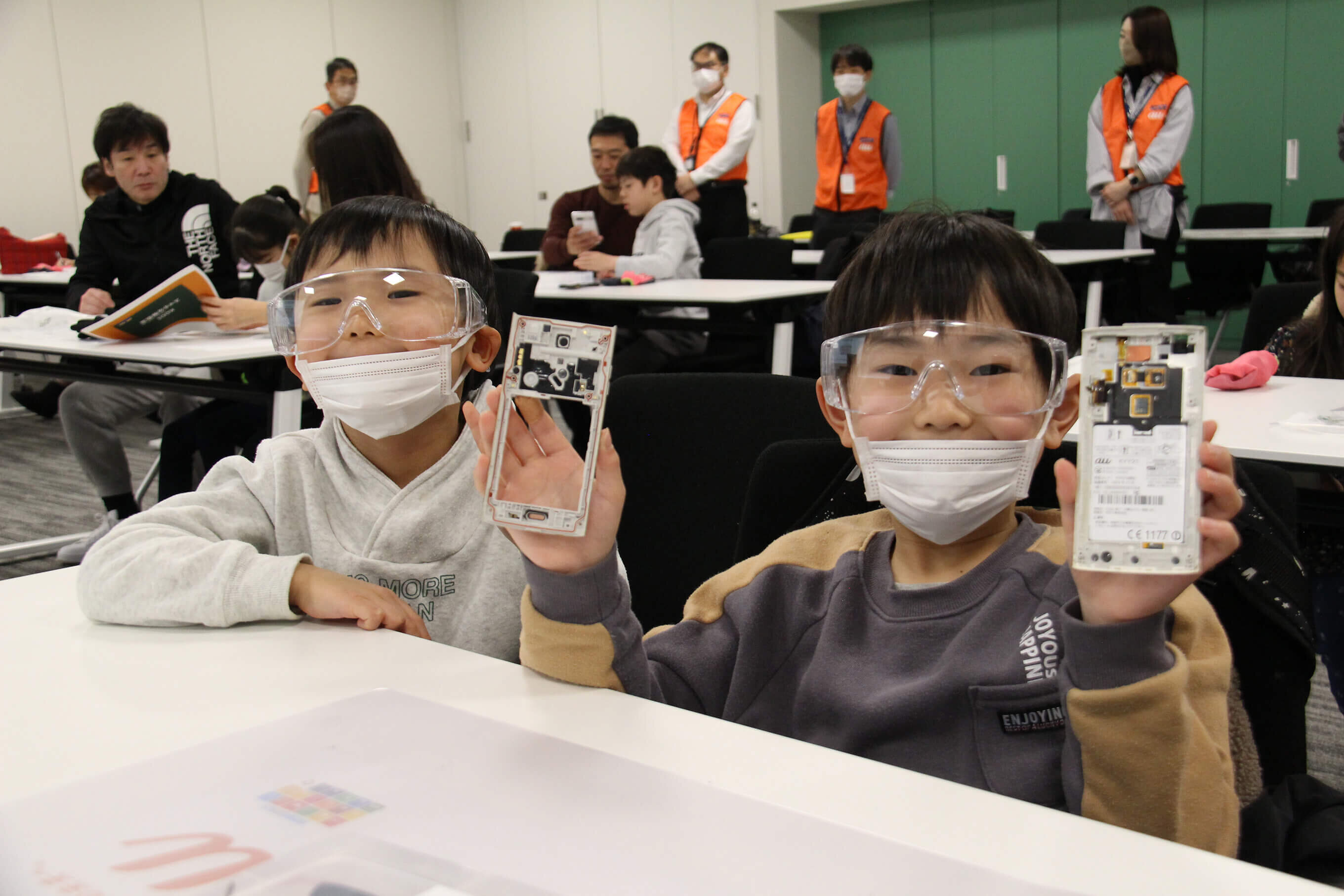 参加者はスマートフォンの分解を自ら体験し、分解されたスマホがどのようにリサイクルされ、有効な資源活用につながるのかを学びました。