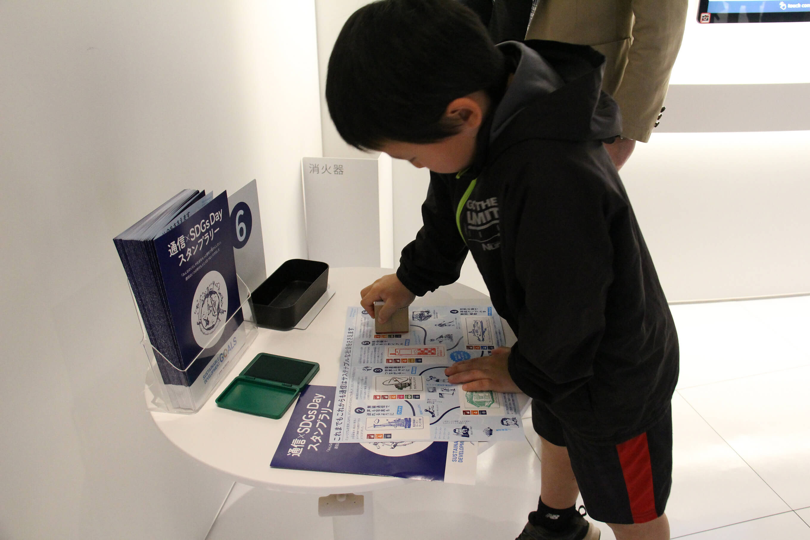 KDDI MUSEUMでは、来館者の皆さんにミュージアムを見学しながらスタンプを集めて、通信にまつわるSDGsについて学べるスタンプラリーを楽しんでいただきました。全てのスタンプを集めると記念品がもらえるとあって、子ども達は館内を見学しながらスタンプ台を一生懸命探していました。