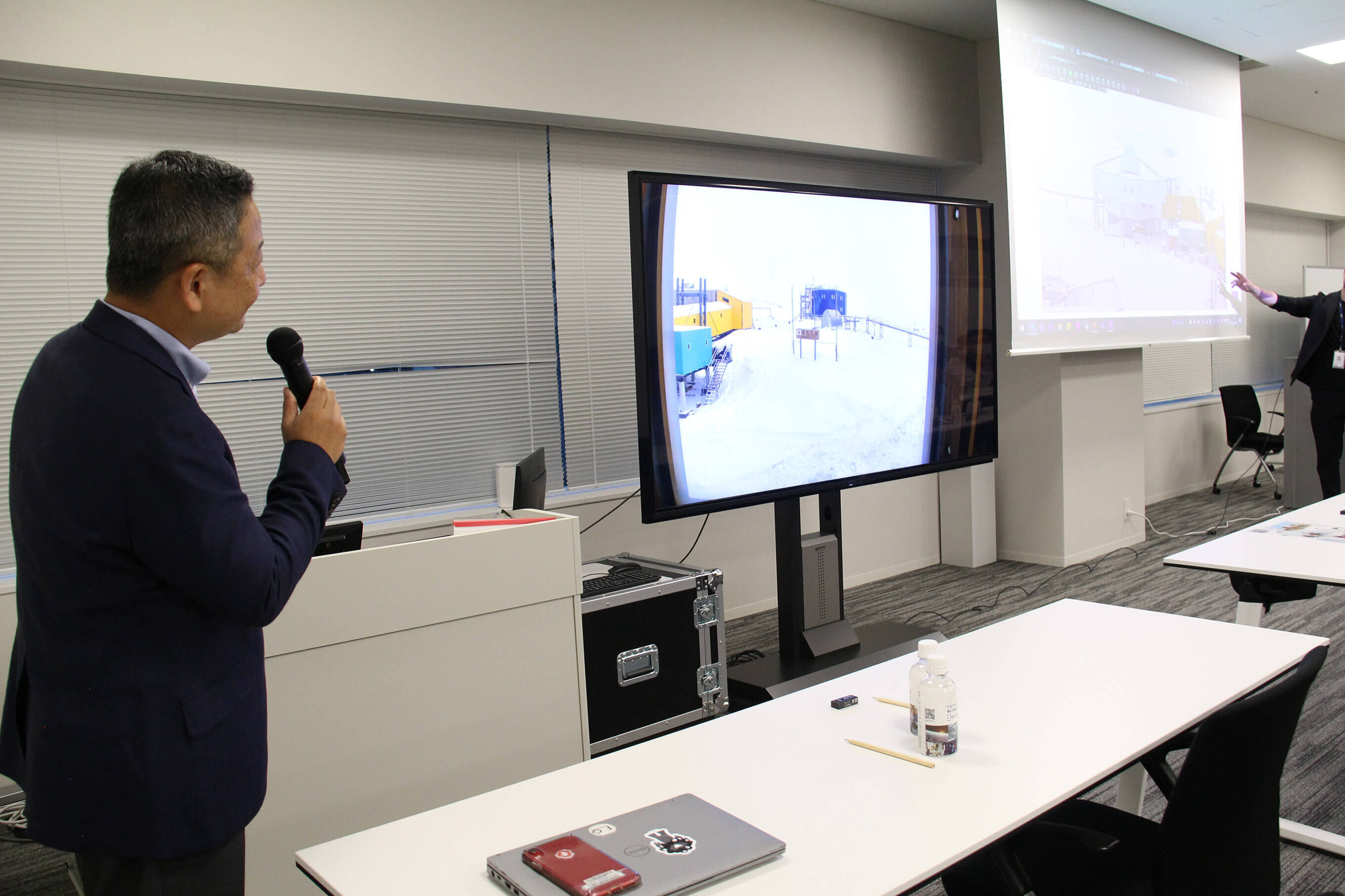 KDDI MUSEUM見学の後は、現在、KDDIから国立極地研究所に出向し、第65次南極地域観測隊として現地で勤務する社員と8Kライブ中継をつなぎ、参加者と交流してもらいました。KDDI総合研究所では国立極地研究所と衛星回線を用いた8K映像の伝送を共同研究しています。