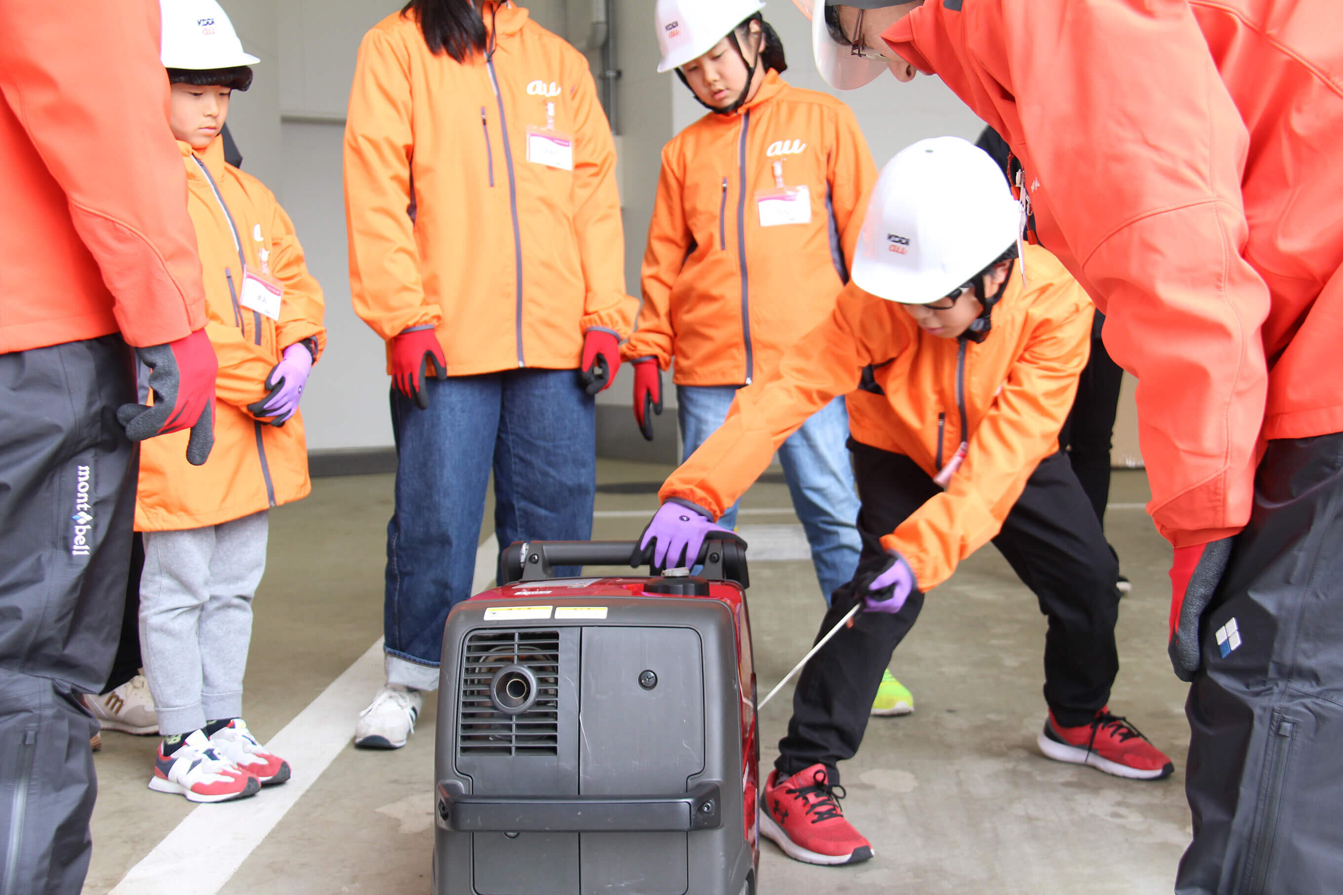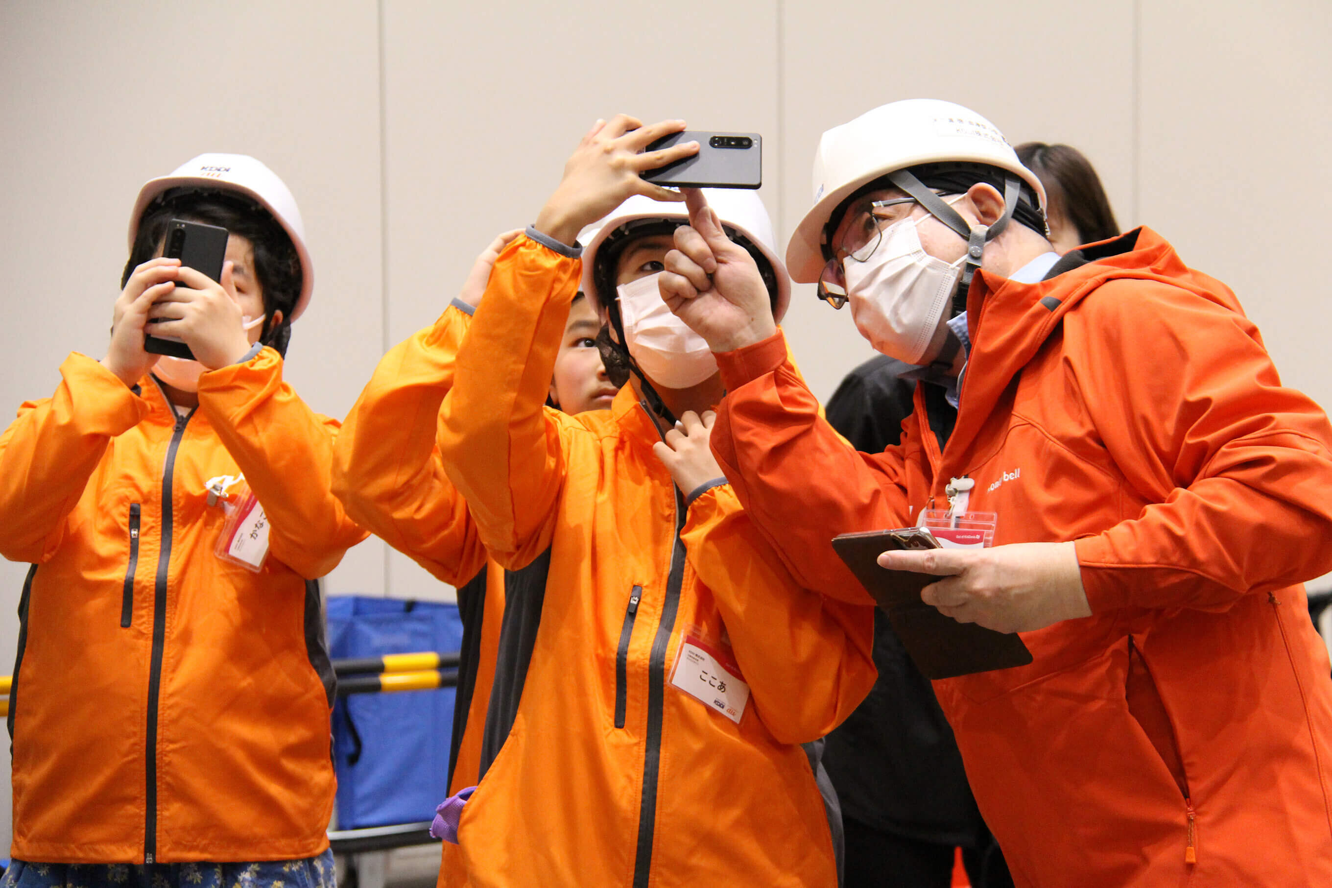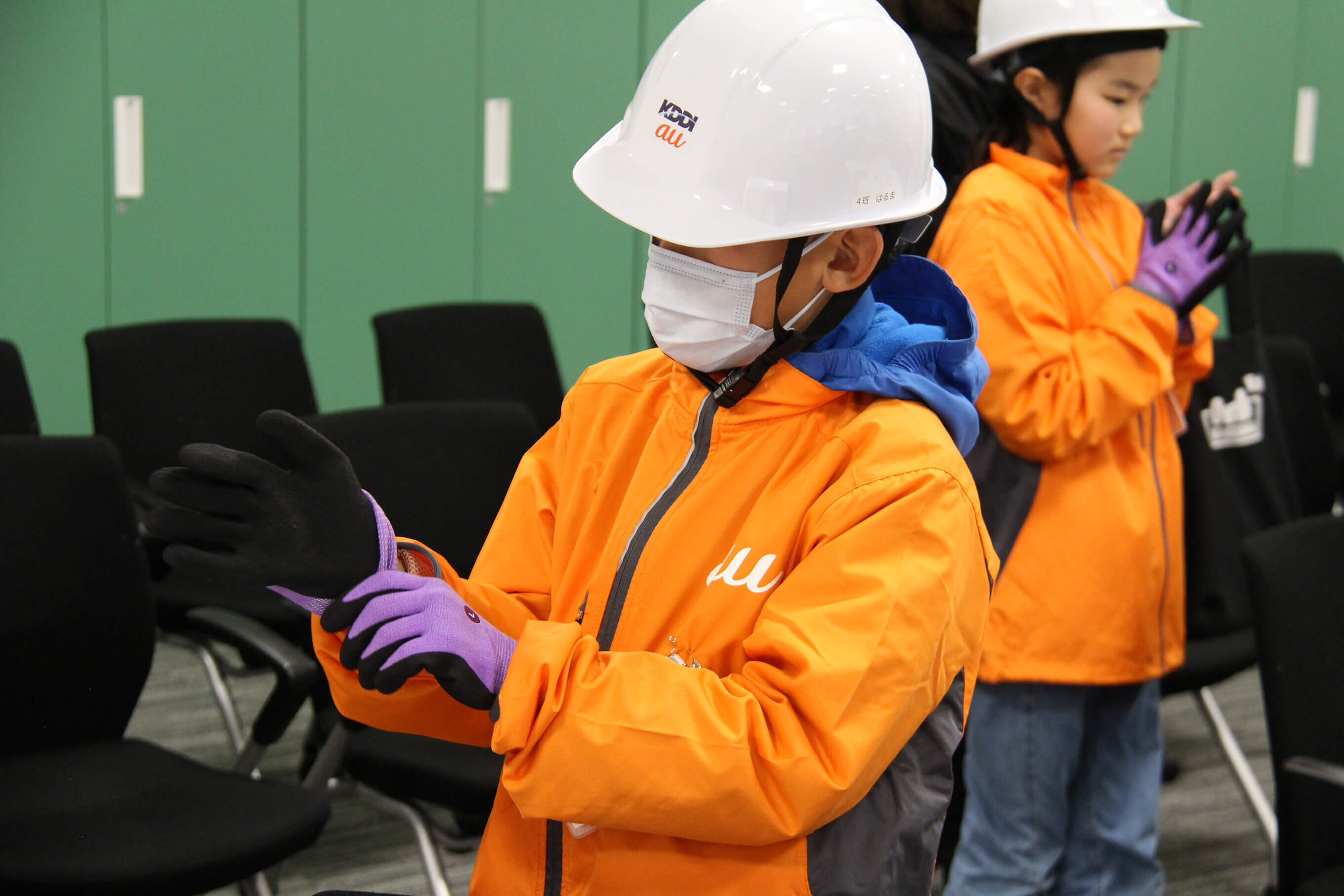 ここからは2班ずつに分かれて「車載型基地局立ち上げ訓練」「可搬型基地局立ち上げ訓練」「避難所支援訓練」の3つの実地訓練を行いました。キッズスタッフは、お揃いのTシャツの上にオレンジのジャンパーを羽織り、ヘルメットと手袋を身に着けて準備万端です。