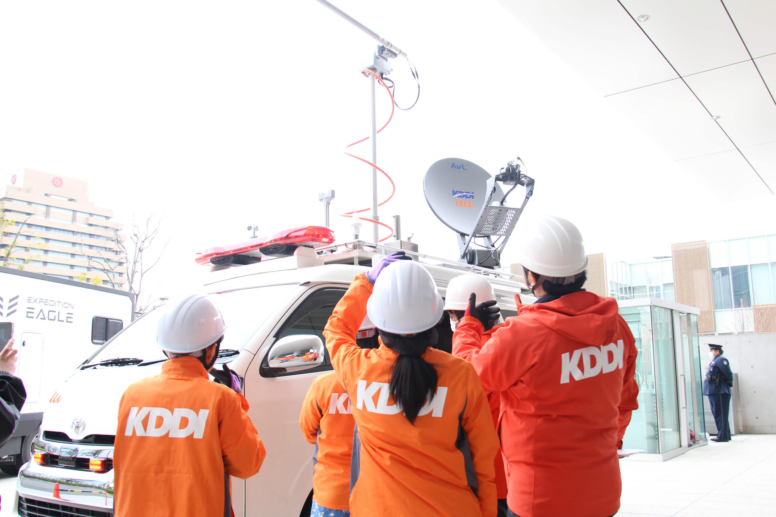 地震で基地局が故障し、電話やインターネットがつながらない市役所の通信を「車載型基地局」で復旧させます。まずは衛星電話で本部に作業開始を報告。